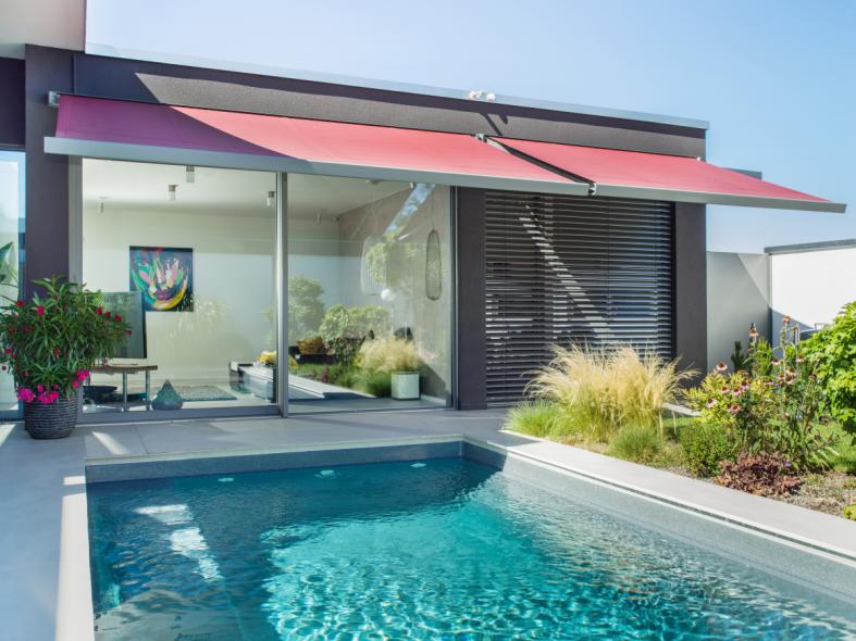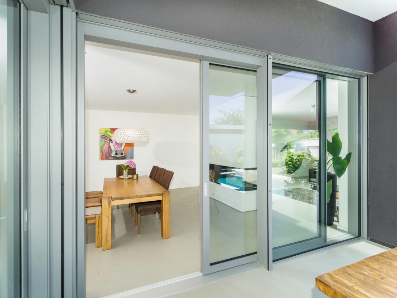Alu-Holz-Hebe-Schiebetüren barrierefrei mit raumhoher Festverglasung. Fassadenraffstore mit gebördelter Lammelle als Sonnenschutz.