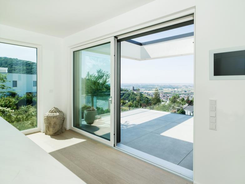 Alu-Holz-Hebe-Schiebetüren barrierefrei mit raumhoher Festverglasung. Fassadenraffstore mit gebördelter Lammelle als Sonnenschutz.