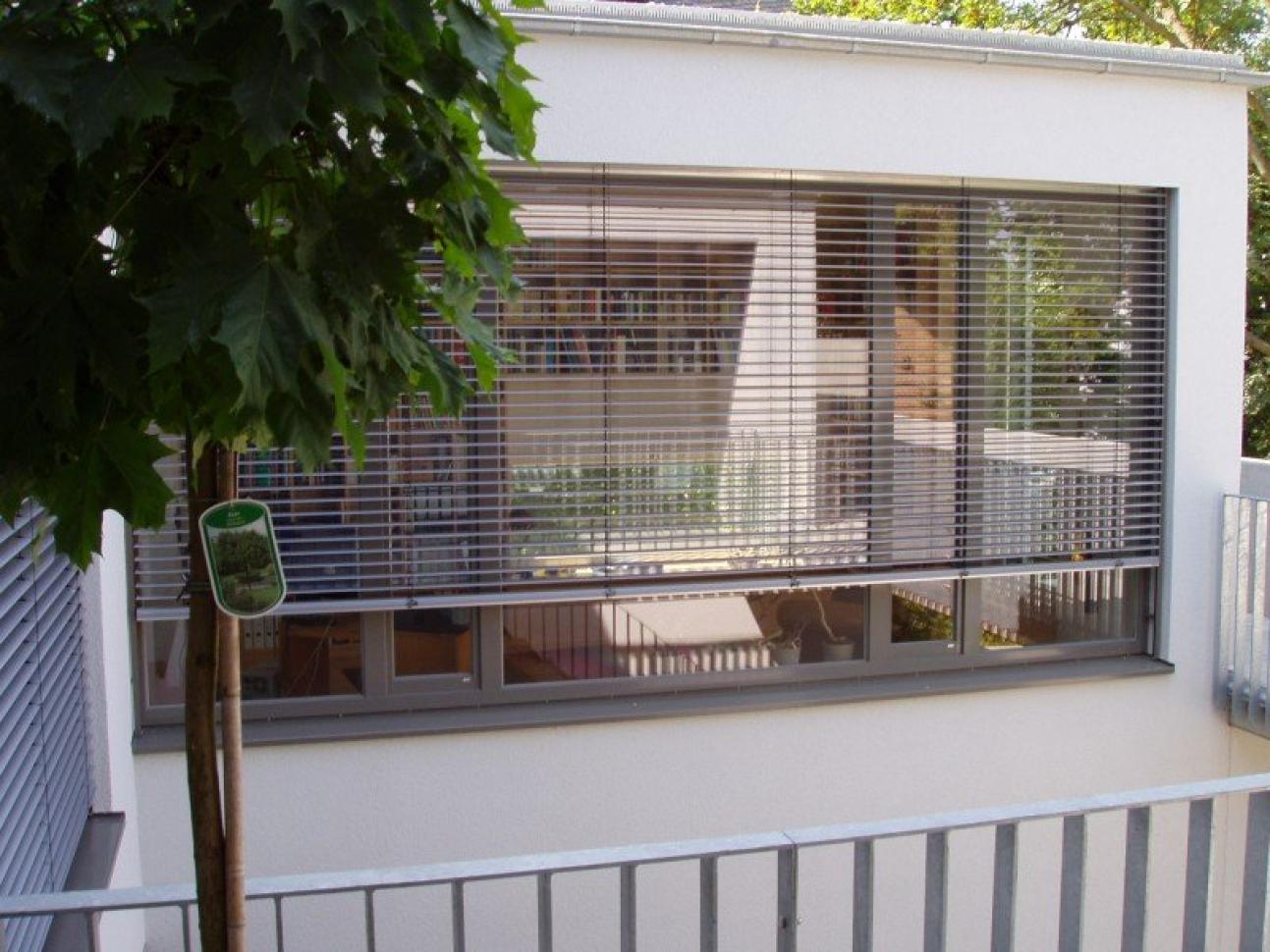 Alu-Holz-Hebe-Schiebetüren barrierefrei mit raumhoher Festverglasung. Fassadenraffstore mit gebördelter Lammelle als Sonnenschutz.